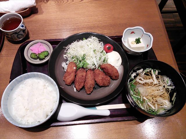 ![]() やっと盛岡駅について駅ビルで昼食のカキフライ定食 |