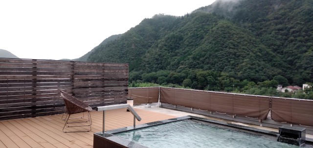 この後は夕食をしながら目の前の長良川での鵜飼いを見られた。 この日は6隻 雨模様の日だったので乗船しなくて良かったかも(6時半から@4,500円) かがり火をたきながら集結していた 鮎の塩焼きと鮎雑炊が特に美味しかった 3日目 早朝に屋上の露天風呂に行ってみた(昨日は雨だったので)